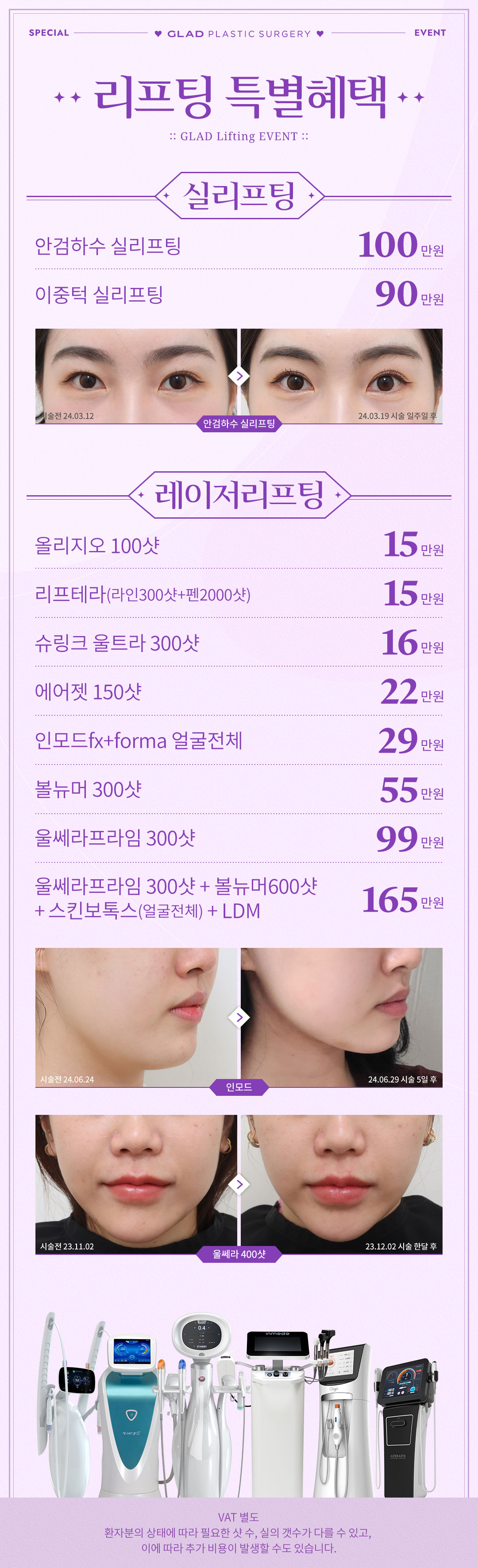 성형수술 및 시술은 환자 개인에 따라 효과가 다를 수 있으며, 출혈, 감염 등의 부작용이 발생할 수 있습니다.